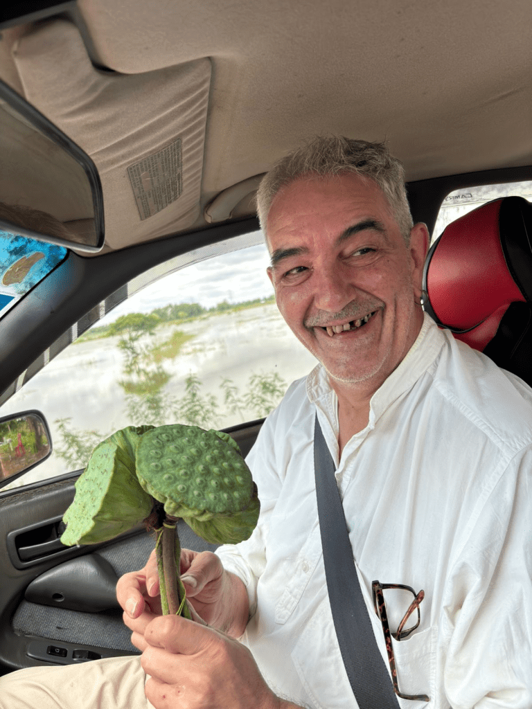 This photo shows me holding a Lotus flower pod, the small buds are the seeds. You remove them, peel the skin from them and eat the kernel which lowers high blood pressure. Theavy had popped out of the car to buy them from one of the traders. No need for Western medications here folks.